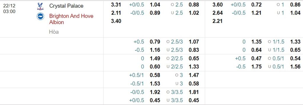 - Mức kèo nhà cái cược chấp trận này: Brighton chấp 0,25 Trái. Crystal Palace ăn 1,04. Brighton ăn 0,89
