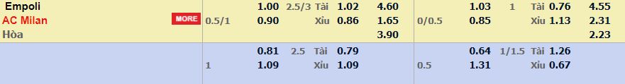 - Mức kèo nhà cái cược chấp trận này: AC Milan chấp 0,75 Trái. Empoli ăn 1,00. AC Milan ăn 0,90