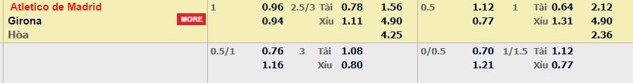 - Mức kèo nhà cái cược chấp trận này: Atl Madrid chấp 1 Trái. Atl Madrid ăn 0,96. Girona ăn 0,94