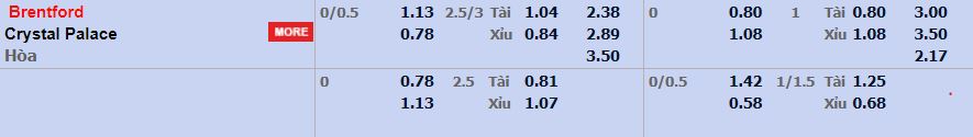 - Mức kèo nhà cái cược chấp trận này: Brentford chấp 0,25 Trái. Brentford ăn 1,13. Crystal Palace ăn 0,78