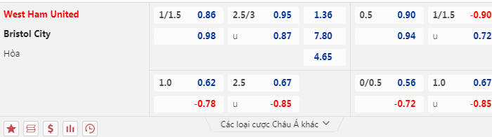 - Mức kèo nhà cái cược chấp trận này: West Ham chấp 1,25 Trái. West Ham ăn 0,86. Bristol City ăn 0,98