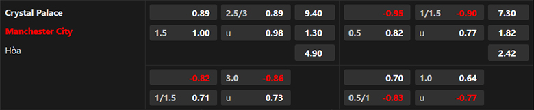 - Mức kèo nhà cái cược chấp trận này: Manchester City chấp 1,5 Trái. Crystal Palace ăn 0,89. Manchester City ăn 1,00