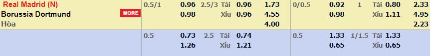 - Mức kèo nhà cái cược chấp trận này: Real Madrid chấp 0,75 trái. Real Madrid ăn 0,96. Dortmund ăn 0,98