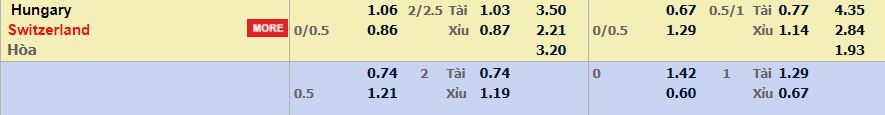 - Mức kèo nhà cái cược chấp trận này: Thụy Sĩ chấp 0,25 trái. Hungary ăn 1,06. Thụy Sĩ ăn 0,86