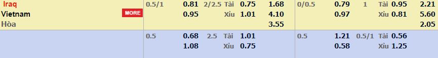 - Mức kèo nhà cái cược chấp trận này: Iraq chấp 0,75 Trái. Iraq ăn 0,81. Việt Nam ăn 0,95