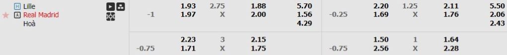 - Mức kèo nhà cái cược chấp trận này: Real Madrid chấp 1 Trái. Lille ăn 0,93. Real Madrid ăn 0,97