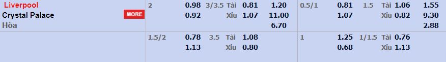 - Mức kèo nhà cái cược chấp trận này: Liverpool chấp 2 Trái. Liverpool ăn 0,98. Crystal Palace ăn 0,92