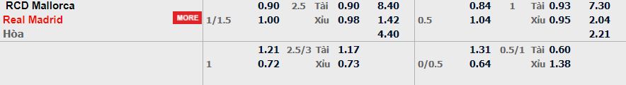 - Mức kèo nhà cái cược chấp trận này: Real Madrid chấp 1,25 Trái. Mallorca ăn 0,90. Real Madrid ăn 1,00