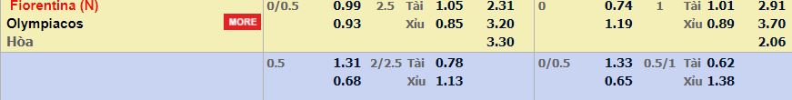 - Mức kèo nhà cái cược chấp trận này: Fiorentina chấp 0,25 Trái. Fiorentina ăn 0,99. Olympiacos ăn 0,93