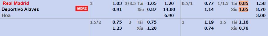 - Mức kèo nhà cái cược chấp trận này: Real Madrid chấp 2 Trái. Real Madrid ăn 1,04. Alaves ăn 0,91
