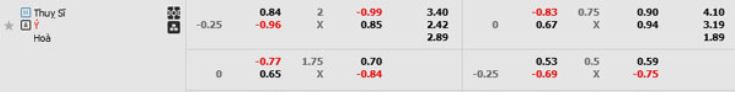 - Mức kèo nhà cái cược chấp trận này: Ý chấp 0,25 Trái. Thụy Sĩ ăn 0,84. Ý ăn 1,00