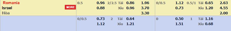 - Mức kèo nhà cái cược chấp trận này: Romania chấp 0,5 Trái. Romania ăn 0,96. Israel ăn 0,88